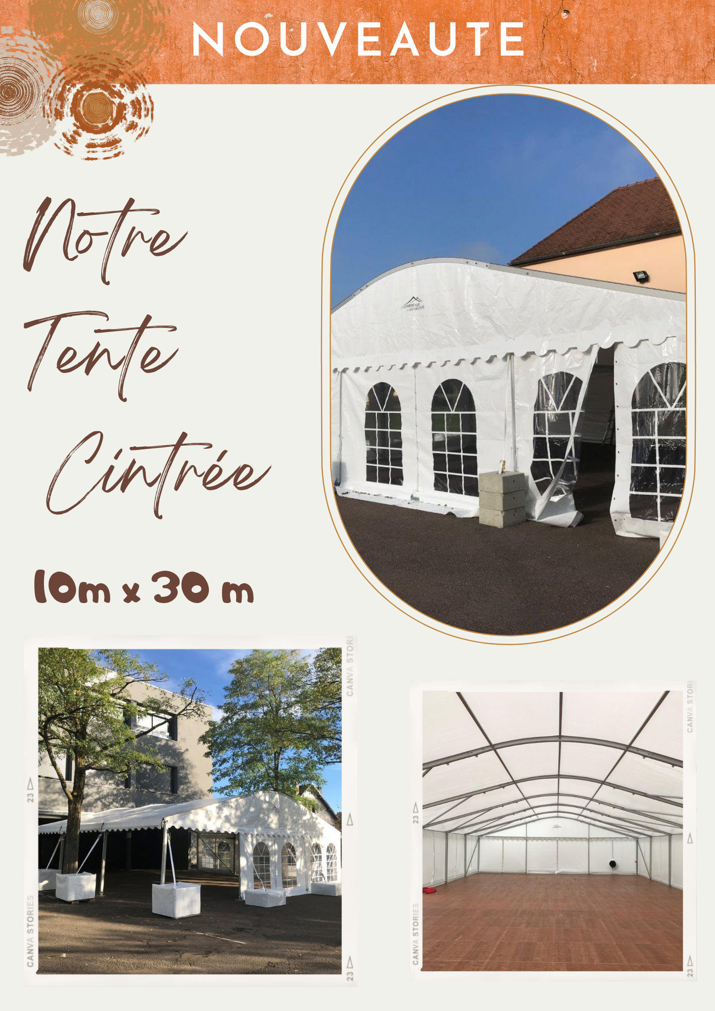 Il s’agit d’une structure traditionnelle de 15 m x 25 m avec plancher auto-porté, entoilage blanc sur 3 travées et entoilage TOUT CRISTAL sur un pignon complet et sur une travée (TOIT et RIDEAUX TOUT CRISTAL)